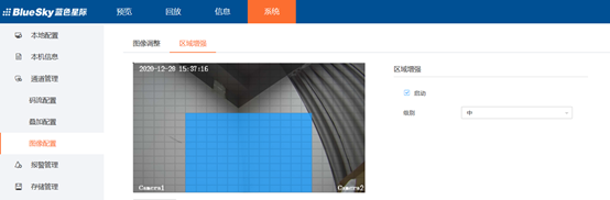 該NVR開(kāi)機(jī)后,顯示的主菜單界面簡(jiǎn)潔,操作易上手。共分為預(yù)覽、回放、信息、系統(tǒng)四個(gè)部分組成,其中系統(tǒng)模塊有本地設(shè)置、本機(jī)信息、通道管理、流碼配置、疊加配置、圖像配置、報(bào)警管理、存儲(chǔ)管理等。下圖為圖像配置功能中實(shí)現(xiàn)區(qū)域增強(qiáng)功能的畫(huà)面。