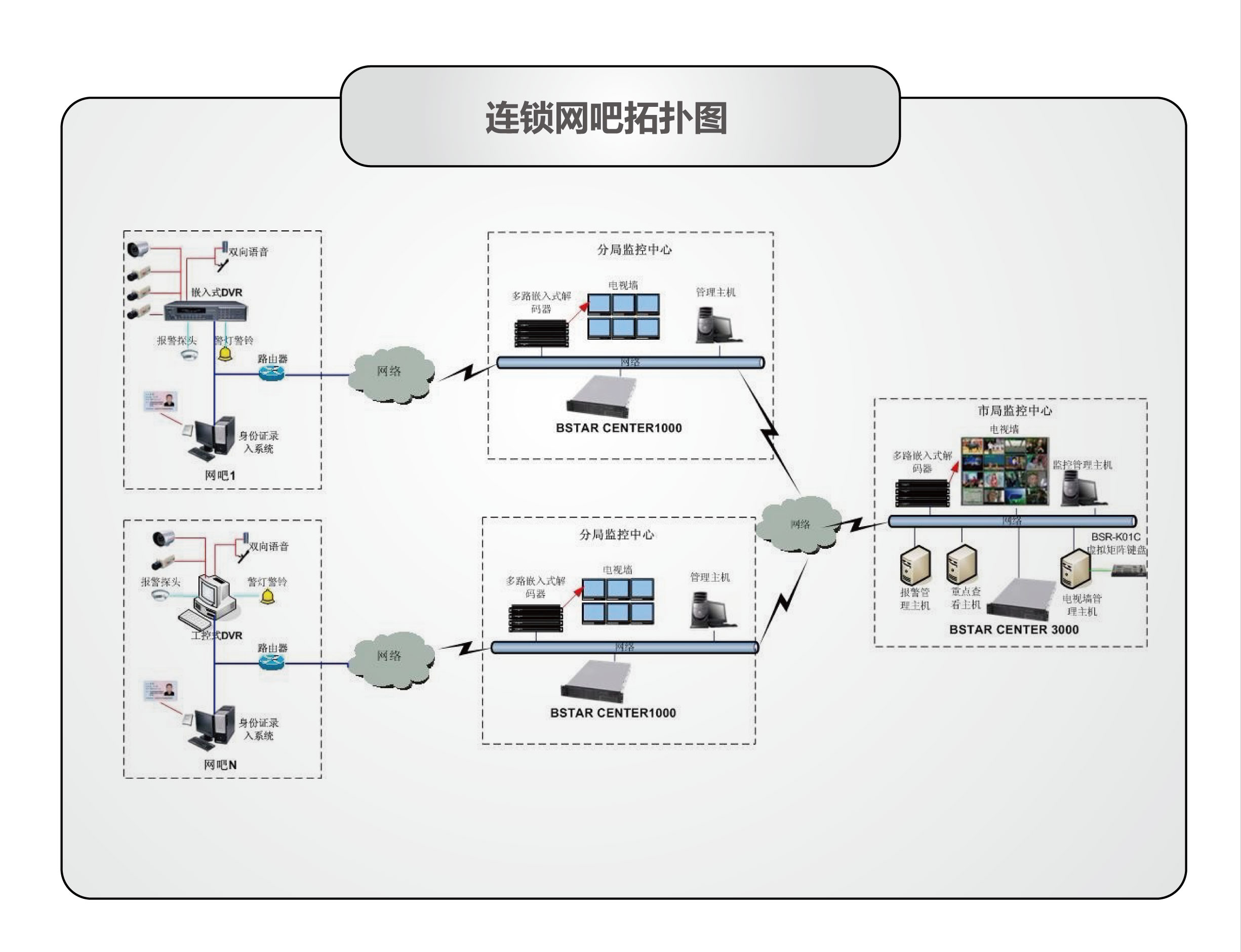 網(wǎng)吧視頻監(jiān)控報(bào)警管理系統(tǒng)平臺(tái)總體上可以分為監(jiān)控中心和網(wǎng)吧兩大部分。其中監(jiān)控中心根據(jù)級(jí)別不同,又分為總控中心即市局監(jiān)控中心和分控中心即分局監(jiān)控中心及派出所監(jiān)控中心。